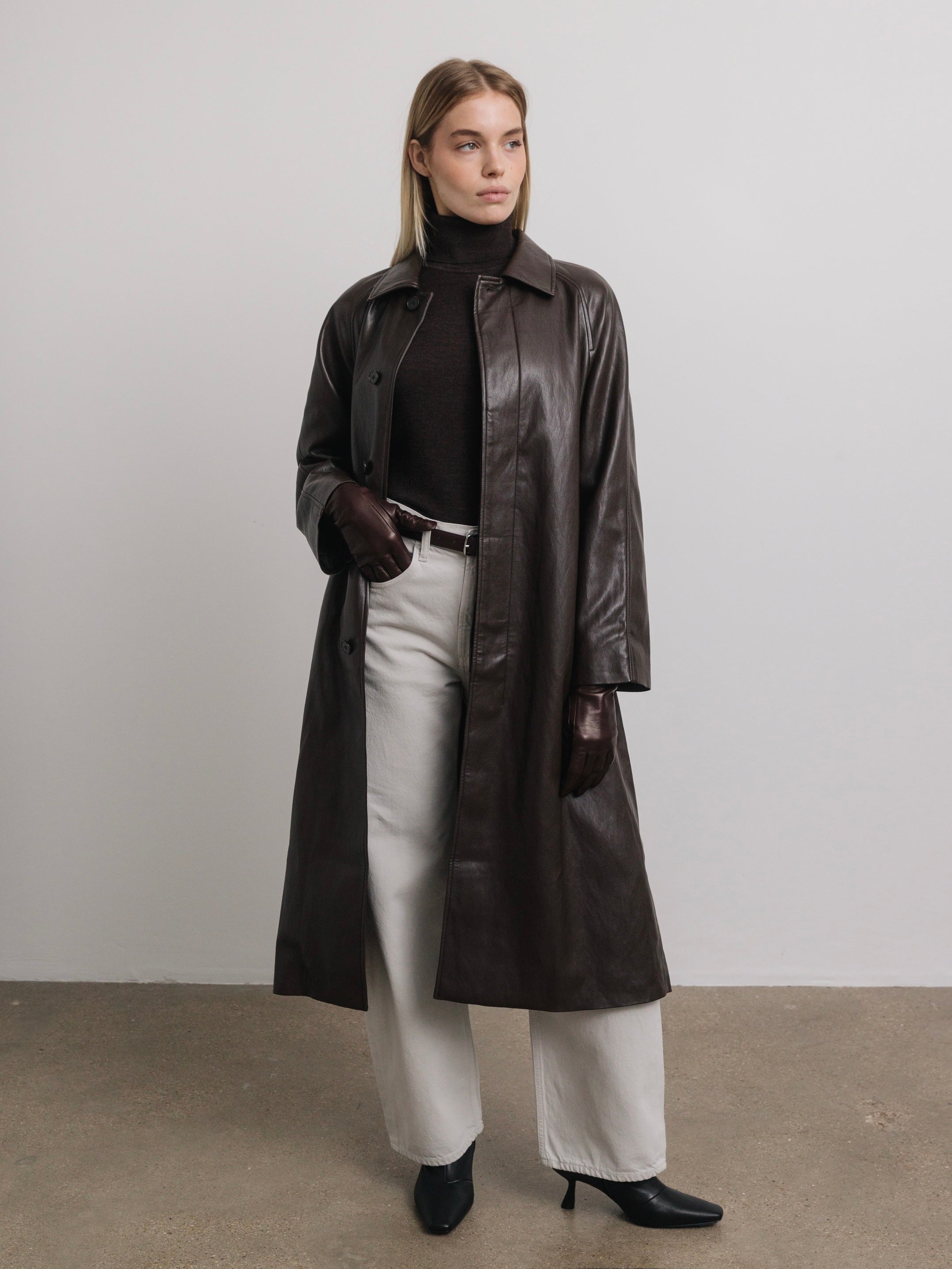 A sleek longline coat exuding iconic 90s sophistication. Our Ciel coat is made from a buttery faux leather in a relaxed single-breasted shape with long sleeves and a waist cinching belt. Its timeless shape pairs well with midi skirts and tailored trousers.