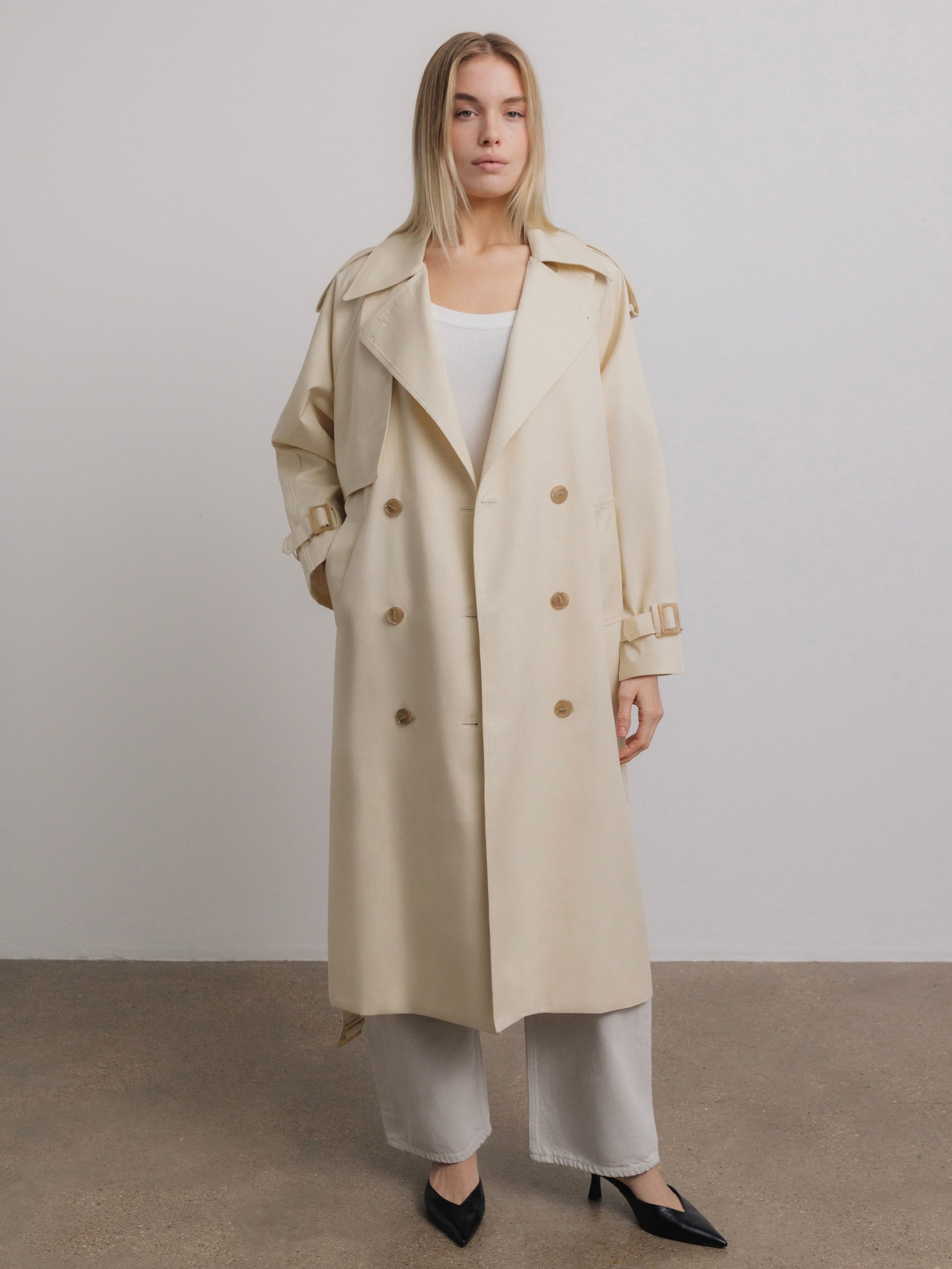 Cut from a mid-weight crepe, the Philippe coat is our modern take on the spring trench. It's tailored in a double-breasted shape and has all the traditional details, including a storm flap, oversized notched lapels, and buckled cuffs that add structure to the billowing sleeves. Wear yours untied for an effortless look, or use the adjustable belt to cinch the waist.