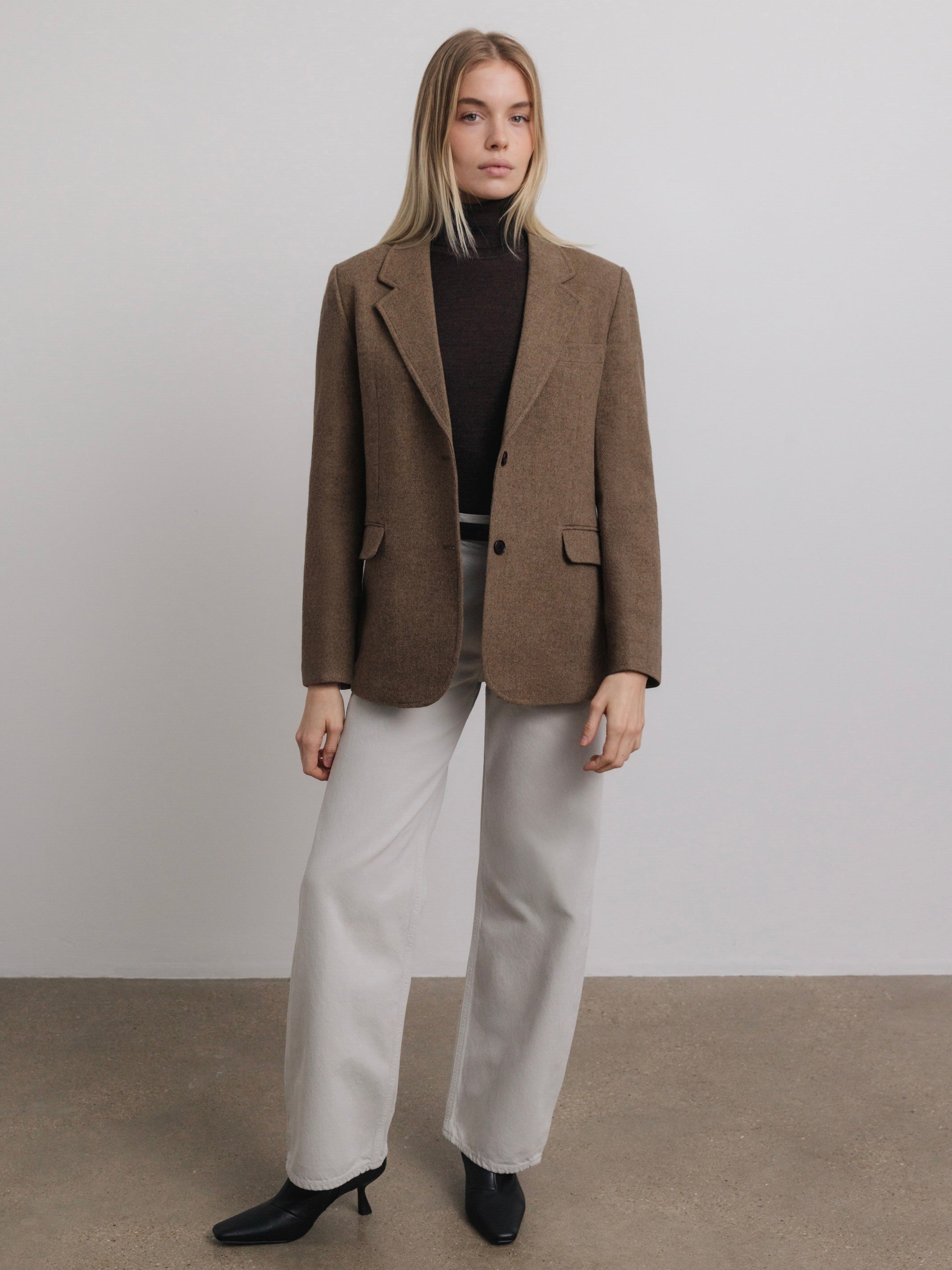 Our London blazer is tailored from a mélange wool tweed in a beautiful brown hue. As timeless as it is versatile, it’s cut for a boxy fit that will pair well with jeans and sleek tailoring.