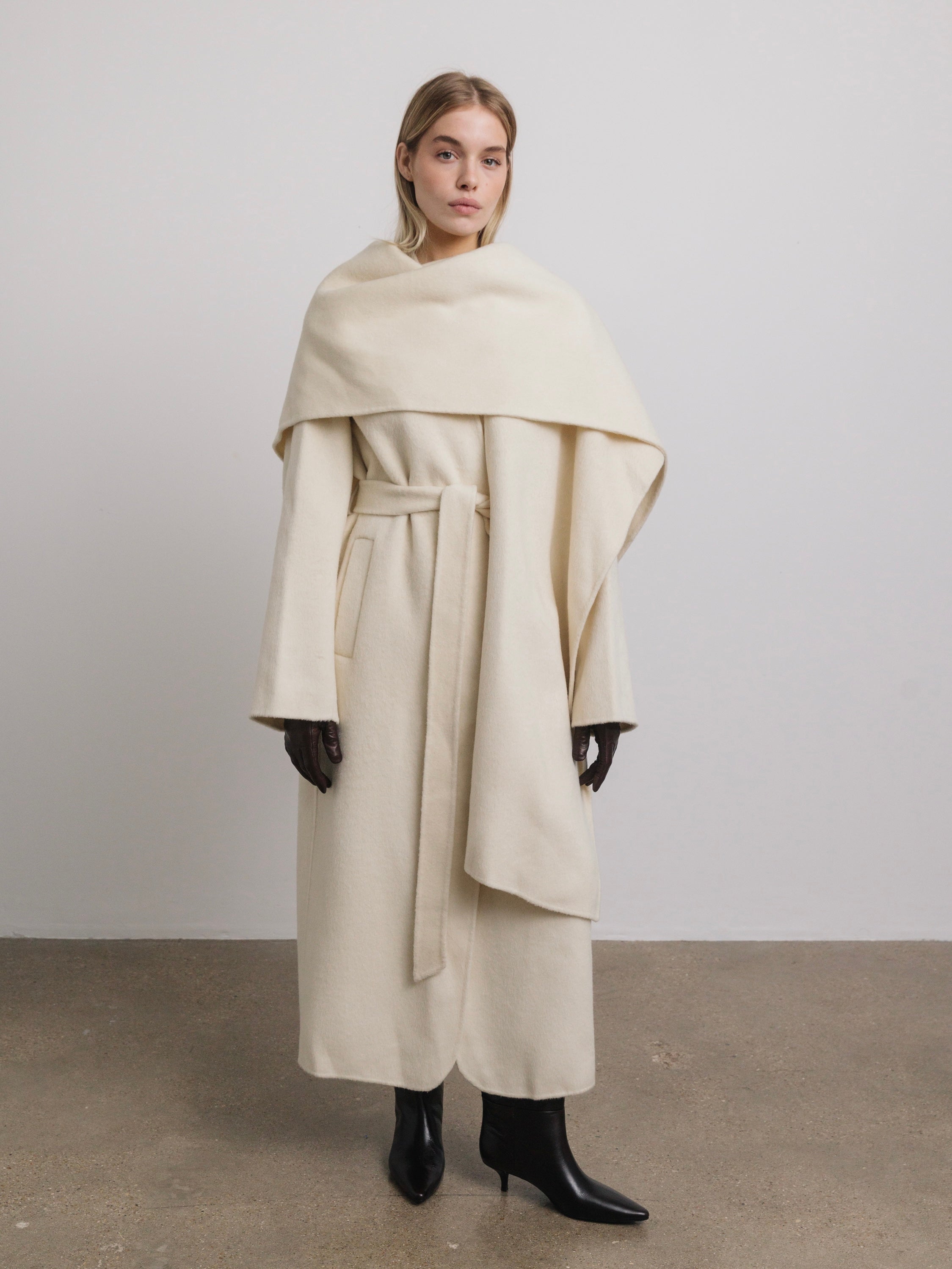 Crafted from pure wool with a luxurious double-faced finish, the Eloise coat transforms winter dressing into an art form. Its relaxed silhouette features dropped shoulders, wide sleeves, and side pockets and a detachable belt. Drape the matching scarf around your neck for extra warmth and style. It’s a beautifully versatile piece that will slot seamlessly into your daily rotation.