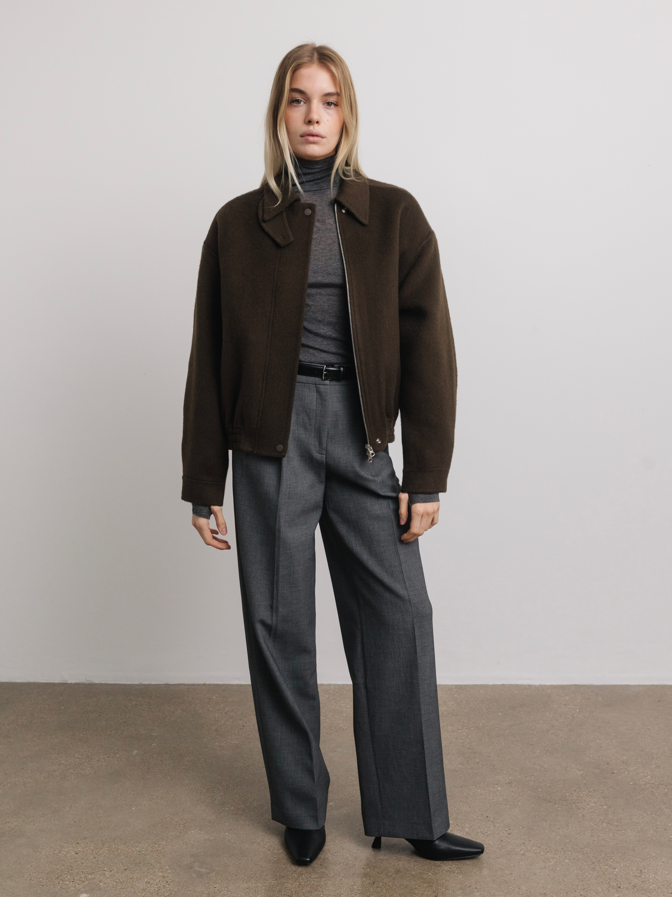 A bomber jacket with a utilitarian twist. Our Kaia wool jacket is cut from a soft wool and camel blend and features a high-neck collar, a boxy silhouette, and a zip and button closure for easy layering.