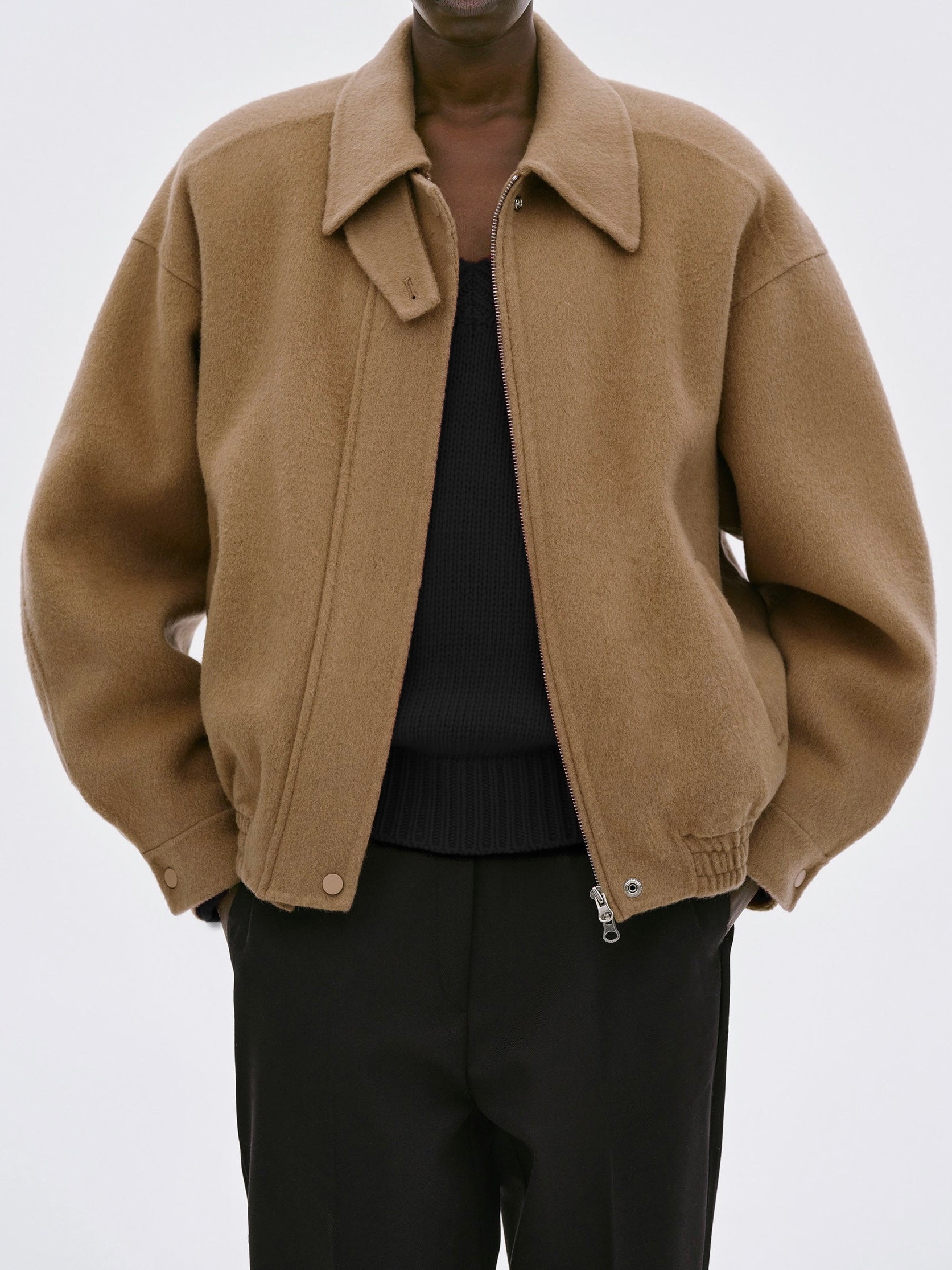 A bomber jacket with a utilitarian twist. Our Kaia wool jacket is cut from a soft wool and camel blend and features a high-neck collar, a boxy silhouette, and a zip and button closure for easy layering.