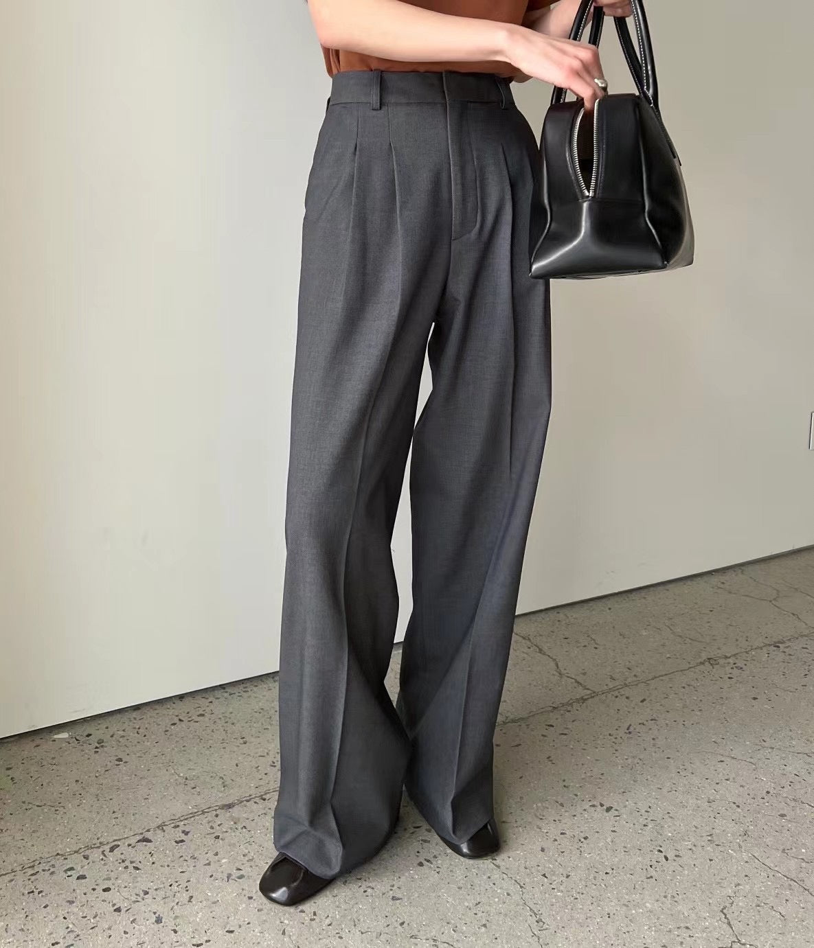 High waisted menswear-inspired pant in a lightweight crepe-wool blend with double pleated front, relaxed leg, front slash pockets and back welt pockets. Style yours with a knit bralette and oversized blazer.