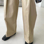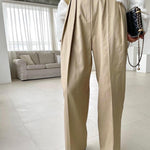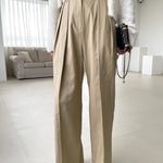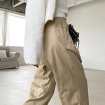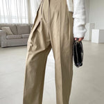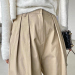 High waisted menswear-inspired pant in a lightweight cotton-blend with double pleated front, relaxed leg, front slash pockets and back welt pockets. Style yours with a cropped knit.