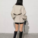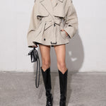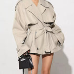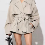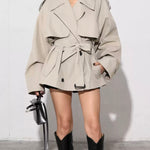 Introducing the Athea- our cropped take on the classic trench coat. Perfect as a statement piece or light spring coat, this versatile piece blends urban edge with masculine appeal. Cut from a smooth cotton blend, it features a boxy silhouette and is complete with storm flaps, shoulder epaulettes and button tabs at the cuffs and belted waist.