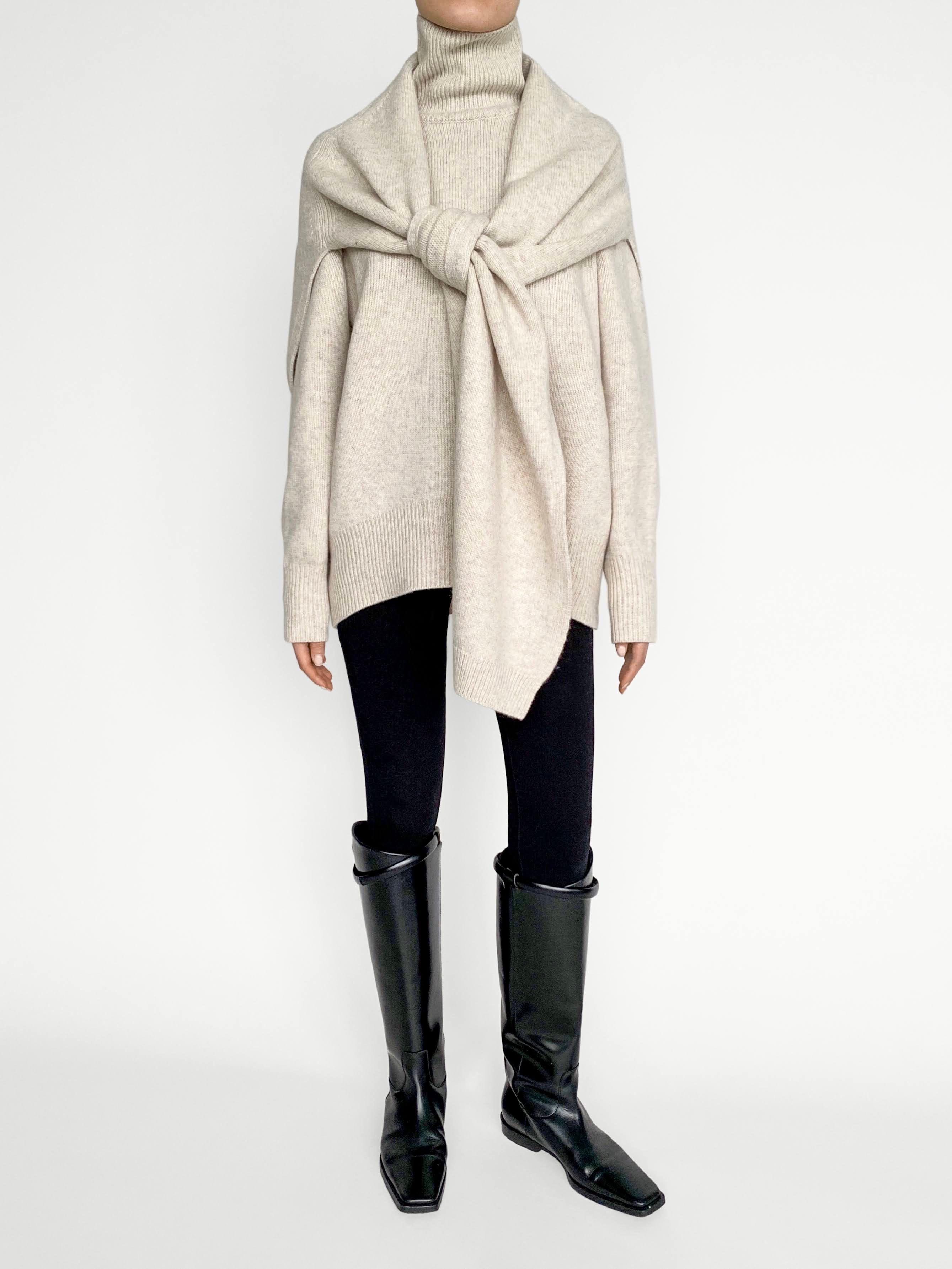 Oversized turtleneck sweater in medium weight wool with ribbed neckline, cuffs, and hem. It's designed in a loose silhouette enhanced by dropped shoulder seams and a cozy turtleneck. Wear it as a set with the matching Celine shawl for a cozy, yet put-together look.