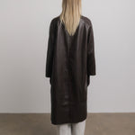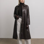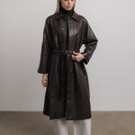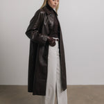 A sleek longline coat exuding iconic 90s sophistication. Our Ciel coat is made from a buttery faux leather in a relaxed single-breasted shape with long sleeves and a waist cinching belt. Its timeless shape pairs well with midi skirts and tailored trousers.
